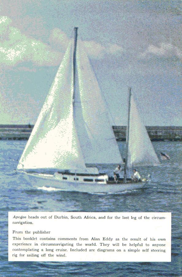 I, too, had these dreams and they burned with enough fire to enable me to realize them. Recently, I completed a circumnavigation of the world, largely singlehanded, in Apogee, a 30 foot SEAWIND ketch. An average sailor before starting, I had dreamed and saved enough to buy and outfit Apogee with a bit left over for the voyage. Apogee followed the usula tradewind route around the world, and the voyage was unusual in only two respects. Apogee is the first fiberglass boat to sail around the world, although I had no idea that this would be the case when I started. In addition, Apogee is one of the few yachts that has the very dubious distinction of being attacked by a school of whales.