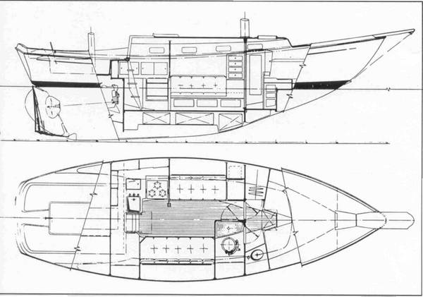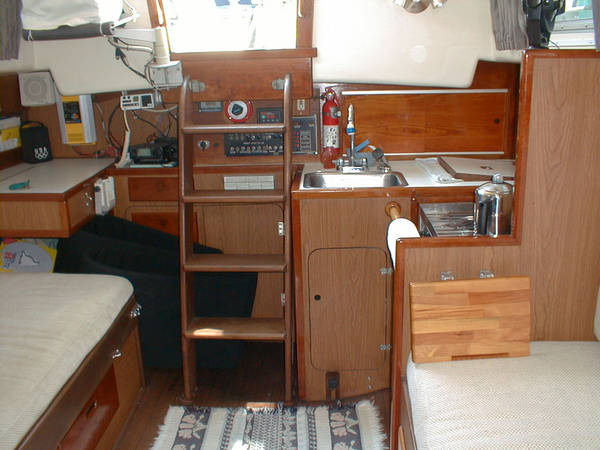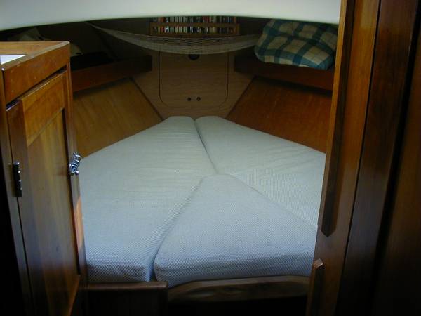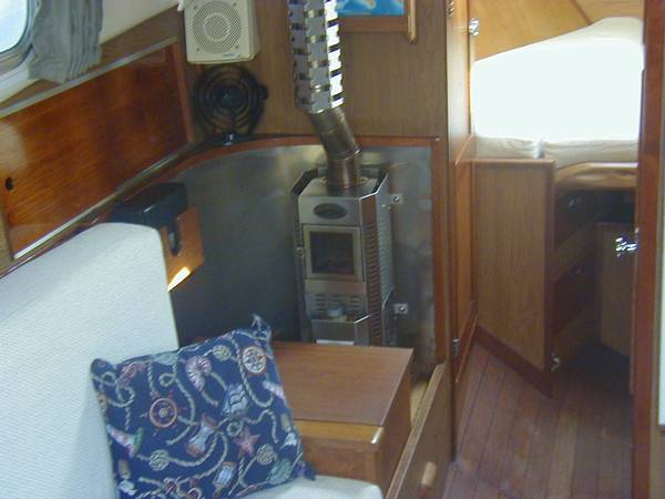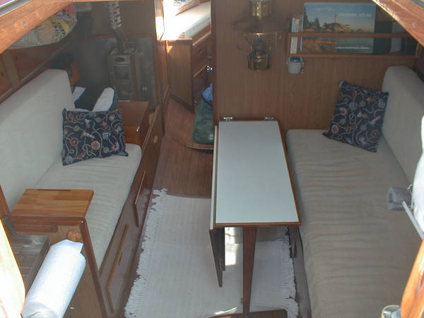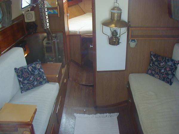 One double berth in V-berth, one double berth on starboard settee, Raritan manual head with approved 3 gal.holding tank. Separate forward salon sink. Interior finish is teak, cherry and white. Dickenson Newport diesel cabin heater. Cabin barometer. Dinette table that comfortably seats four adults. Cabin oil lamp. |