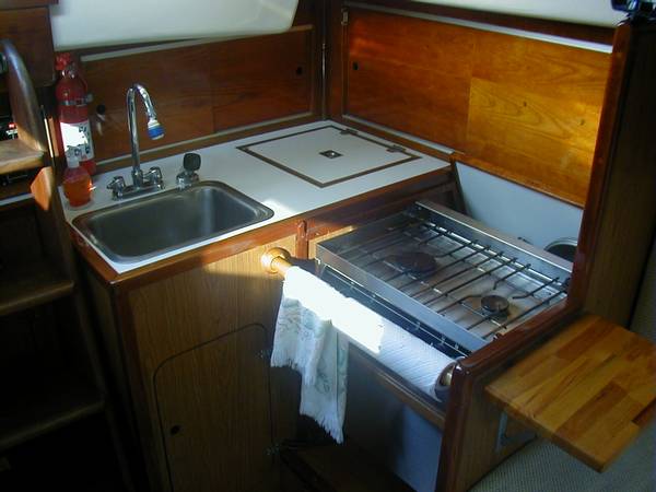 Force 10 two burner propane stove with oven and broiler and separate dedicated propane tank. Adler Barbour Cold machine 12Volt refrigerator with freezer. Deep stainless steel galley sink. |
