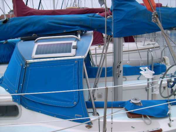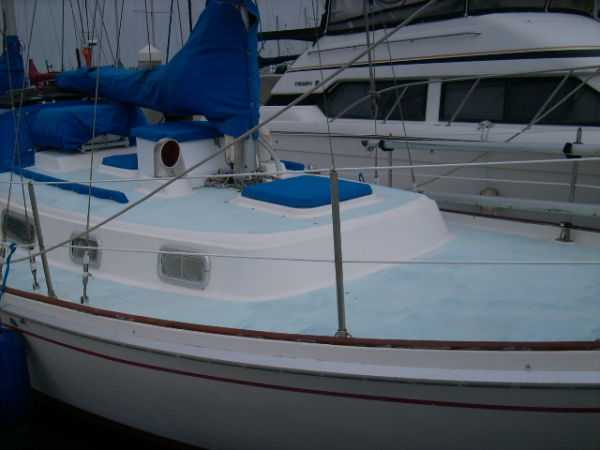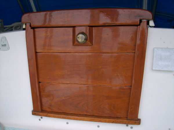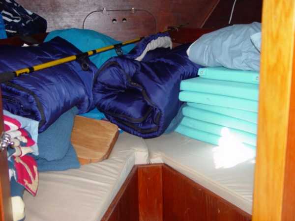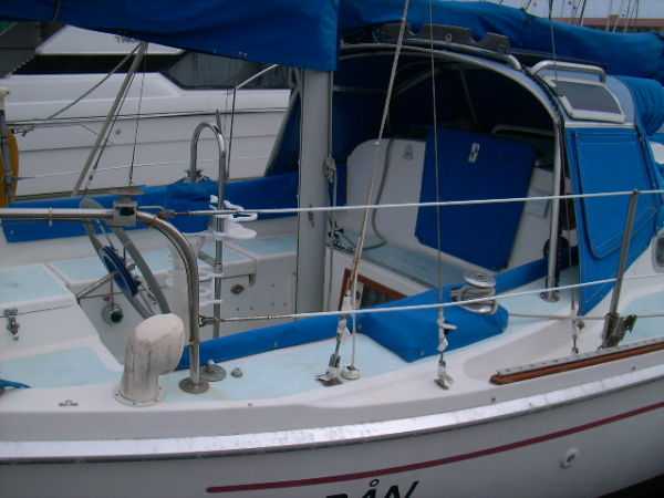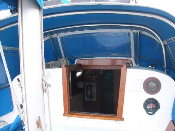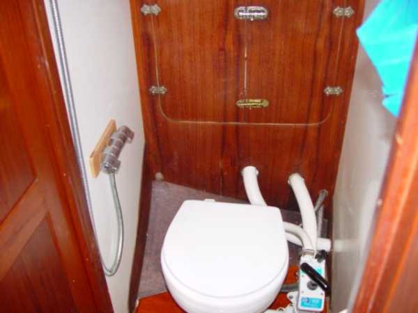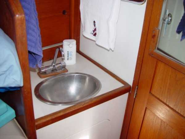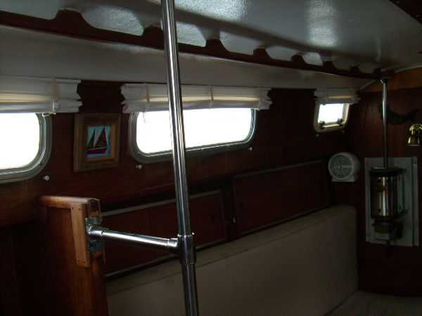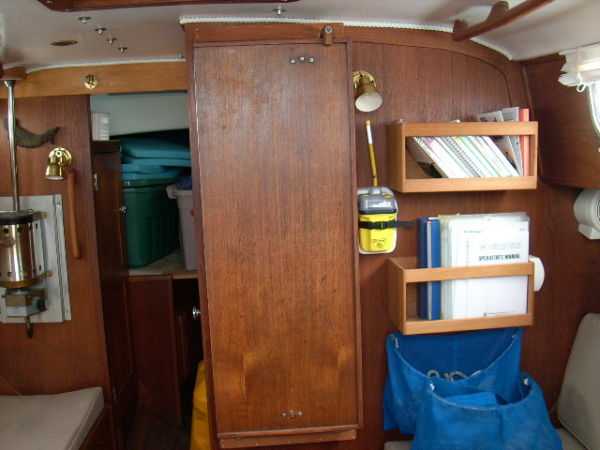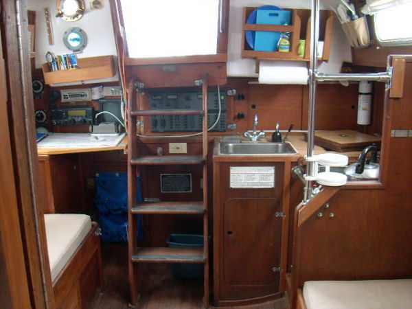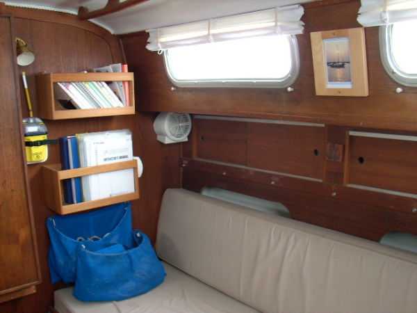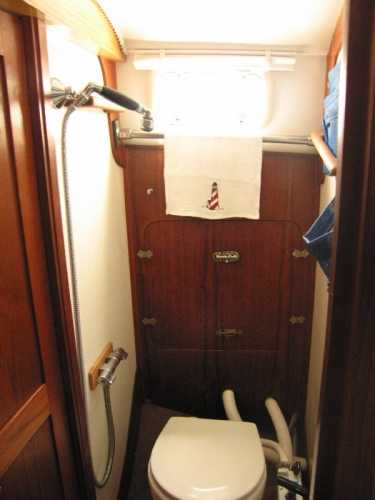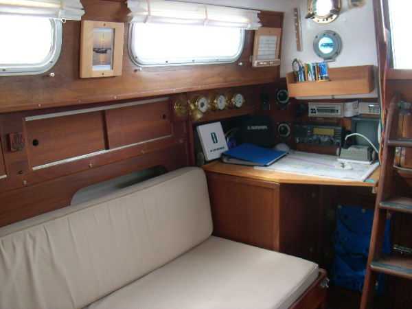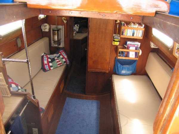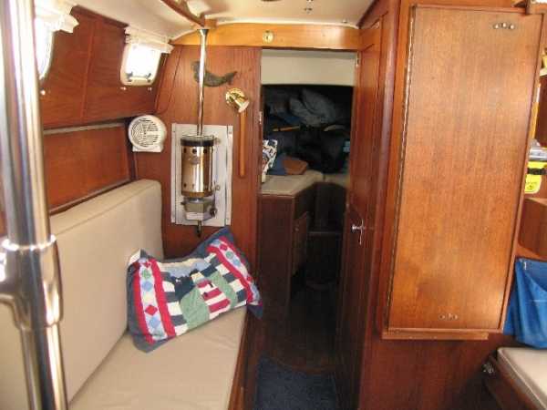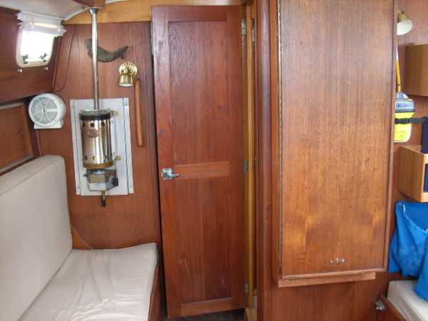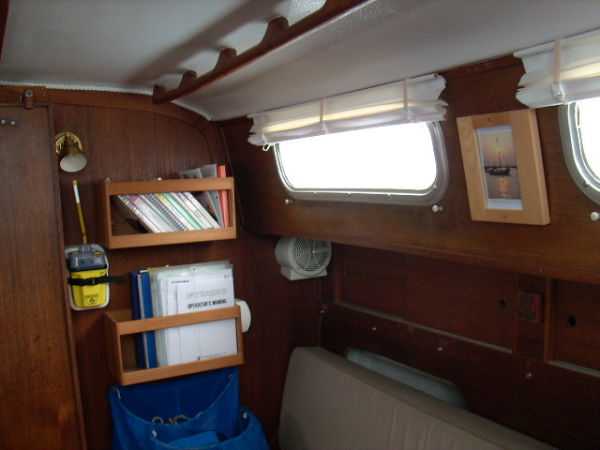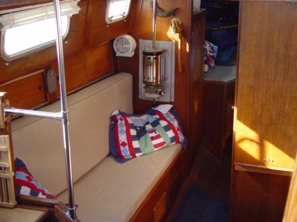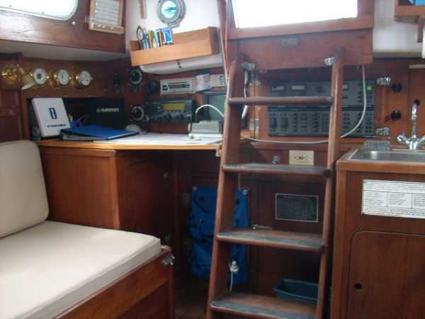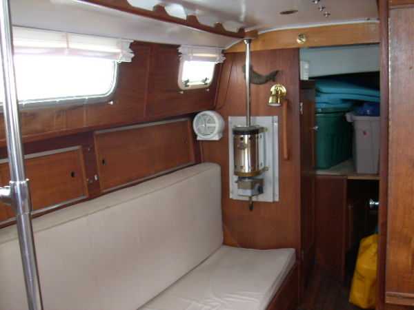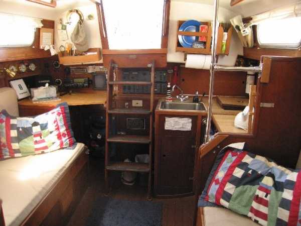 | Accommodations · Wide cabin trunk· Good head room, aprox 6'.2"· Warm interior with plenty of wood· Exellent storage in drawers and bins· forward cabin with V berth and hanging locker· entry to the head from forward cabin· w/o entering main cabin· enclosed head with shower· HOT and Cold press water and water filter.· Separate shower sump pump· Asymetrical settees in main cabin.· Fold down table, shelving behind.· MSD , holding tank,macerator pump, deck pump-out '98.· Port settee is a single berth· Strbrd. pulls out to double berth· Chart table strbrd. aft· Force 10 propane cabin heater· Shades on all ports.
