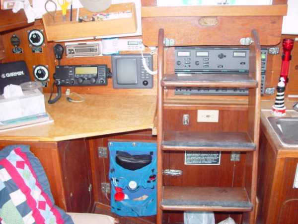 Electronics and Navigation · Binnacle Compass· Plastimo bulkhead compass· Radar , FURUNO 1721 Mk, 24 mile range , antenna on gimbaled mount on mizzen mast '98· Deck repeater for FURUNO GPS data '06· FURUNO 1600 GPS chart plotter/depth sounder/spped log '98· Garmin GPS '98· ICOM 71 RT SSB/HAM radio w PCT II modem '01,earth plate, insulated backstay, automatic tunner· Simrad AP11 autopilot. Robertston drive on quadrant , below-deck main unit.Standard Horizon fixed VHF , mast head antenna· Standard marine CD/Stereo '01 speakers on cabin and cockpit· Brass clock/barometer/hydrometer set