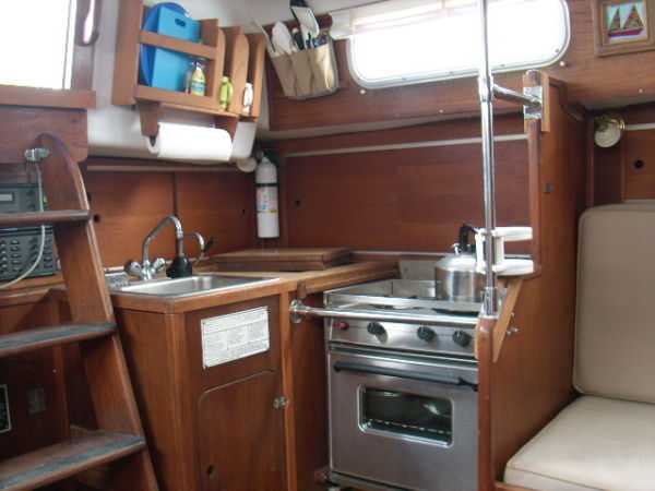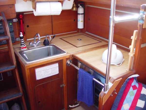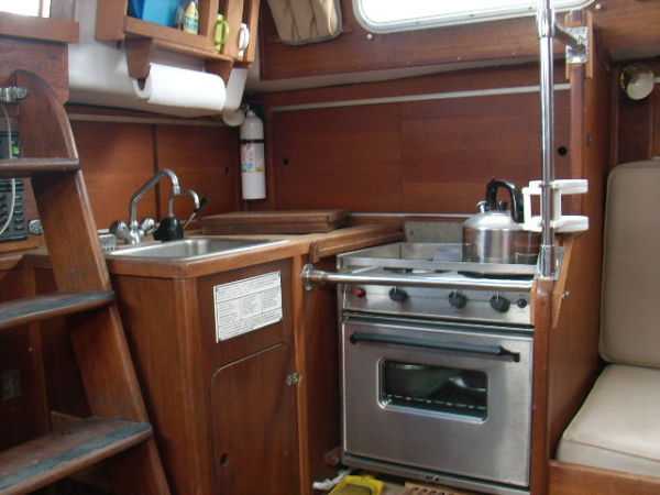Galley · Hillrange 2 burner propane stove with oven '99· Remote gas selenoid· Seafrost BD12 air cooled 12V refrigerator , large ice box· Large deep sink, pressure hot and cold water, water filter, Shanvink fixtures· Sump and pump on sink waste· Manual water pump for back up· PUR 40E Watermaker· Hot water heater· (Seaward , engine heat exchanger & AC power)