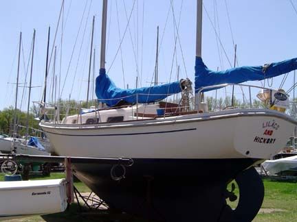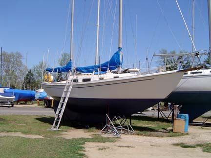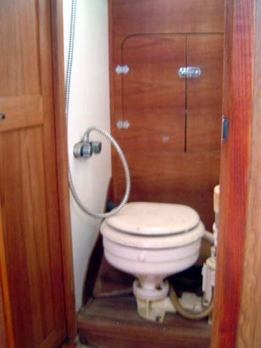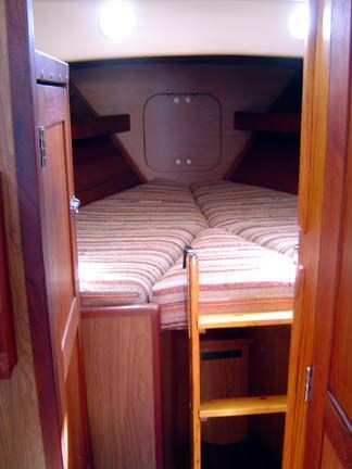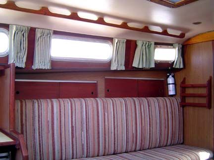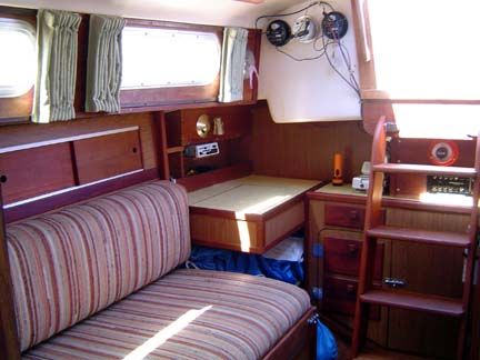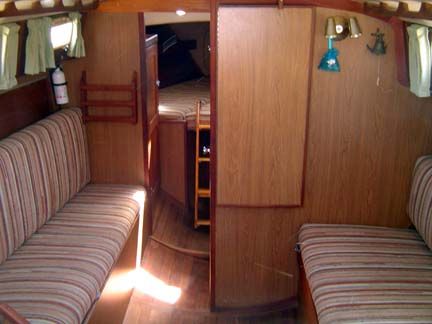 ACCOMMODATIONS: Forward compartment has "V" berth arrangement with chain locker behind forward- bulkheads full length shelves over berths (port and starboard). Teak plywood sheathing on hull sides. Bulkhead mounted dinette, top-loading storage under all berths, 2 large storage ports in back rests of berths, shelves over berths. Head/shower has 2 separate entrances with solid cherry doors, standard marine toilet, storage compartment behind head. Vanity area includes oval stainless steel sink, two large cabinets behind vanity with sliding doors, mirror on head door, Formica counter tops. Teak sole throughout, all wooden bulkheads with attractive wood grain laminate used throughout, one piece molded headliner throughout, all interior trim of natural teak, companionway ladder of solid teak, engine access door behind companionway ladder, teak hatch boards, sliding hatch over companionway. Headroom 6' 2". Berths 6.