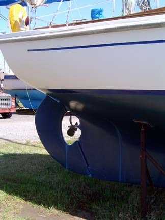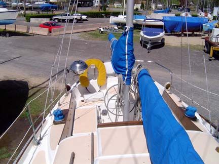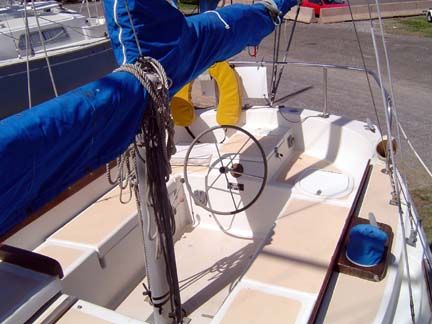 COCKPIT, DECK & HULL: Rack & pinion wheel steering, Deck, cockpit and cabin are reinforced hand lay-up fiberglass with end cut balsa core construction in all walking areas affording additional stiffness and insulation. Non-skid pattern is molded into deck, cockpit and cabin top, deck features molded toe rail, two dorade vents with cowl vents, storm cover over main hatch. The 9' cockpit has large sail lockers port and starboard, raised helmsman seat. Stainless steel stemmed fitting with bowsprit, aluminum rub rail, 10½ " bow cleat, 8' Genoa tracks with cars port and starboard mounted on rail, interior and companionway handrails, forward hatch, 4 large fixed ports, 4 small fixed ports, aluminum main sheet traveler with car and stops mounted on bridge deck, 24" stainless steel stanchions and single vinyl covered lifelines, (2) 8" stern cleats and chocks.