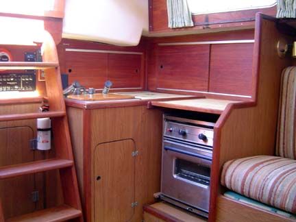 GALLEY: Gimbaled 2 burner gas stove & oven, 6 cubic ft. capacity top-loading ice box with teak shelves, four large cabinets with sliding doors behind stove, large deep stainless steel sink, Hot & Cold pressure water hand operated ice box water pump, storage areas below sink, Formica counter tops throughout galley area, cutting board cover over sink.