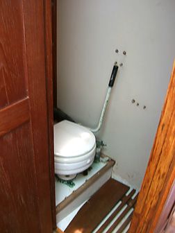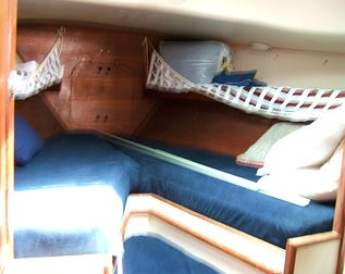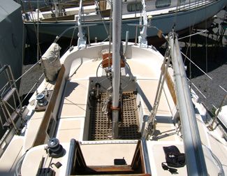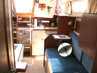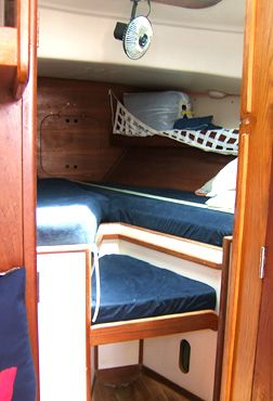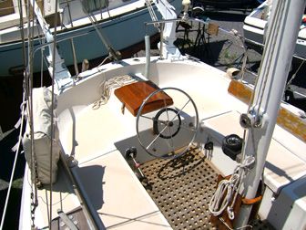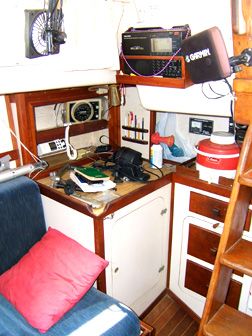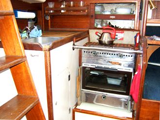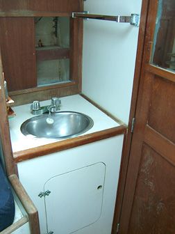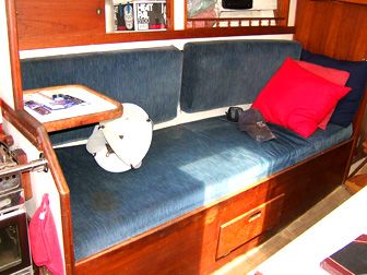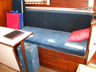 Accommodations The salon had cushions with new foam in the settees. There is a fold-down dining table seating 4-6 that mounts against the bulkhead. Custom made screens for all hatches and portholes. 6'2" headroom. The galley is equipped with gimballing stainless steel 2-burner Origo stove with oven, icebox that holds 80+ lbs. of ice with plenty of room for food, refrigeration compressor, dishes, pressure fresh water at faucet and foot pump, and a sea water hand pump. |