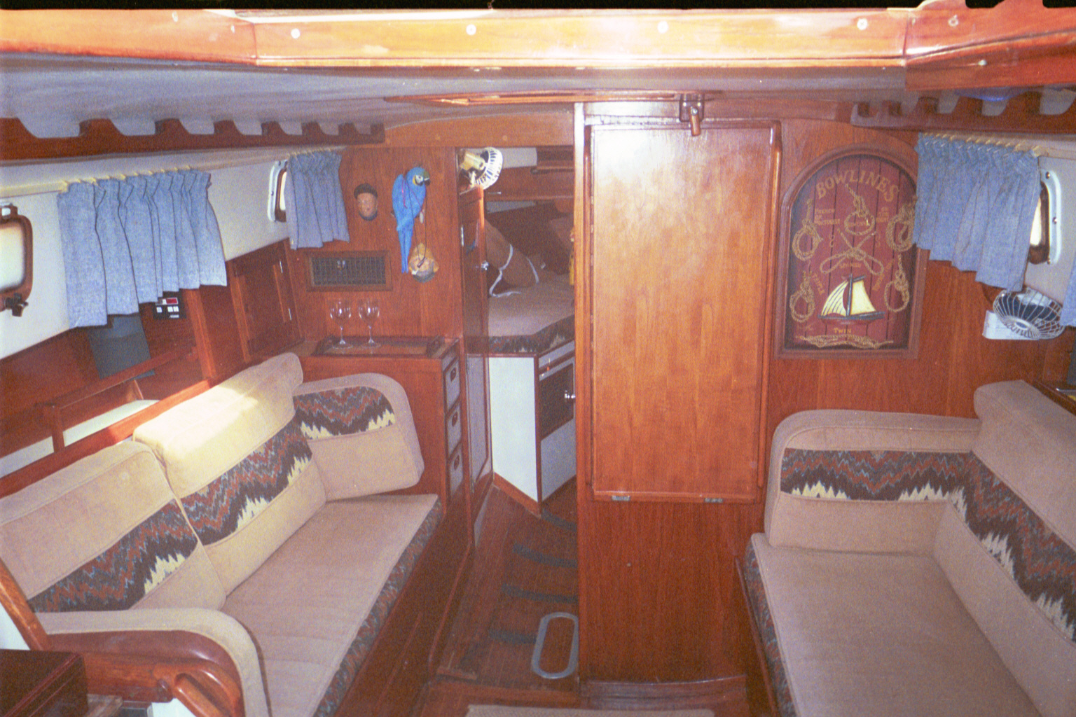V-berth forward with locker to port and head/shower to starboard, main salon has settee with fold down table, starboard settee converts to full size pull out bunk, interior fans, cockpit cushions,Hot and cold pressure water/ outside hot and cold water pressure
