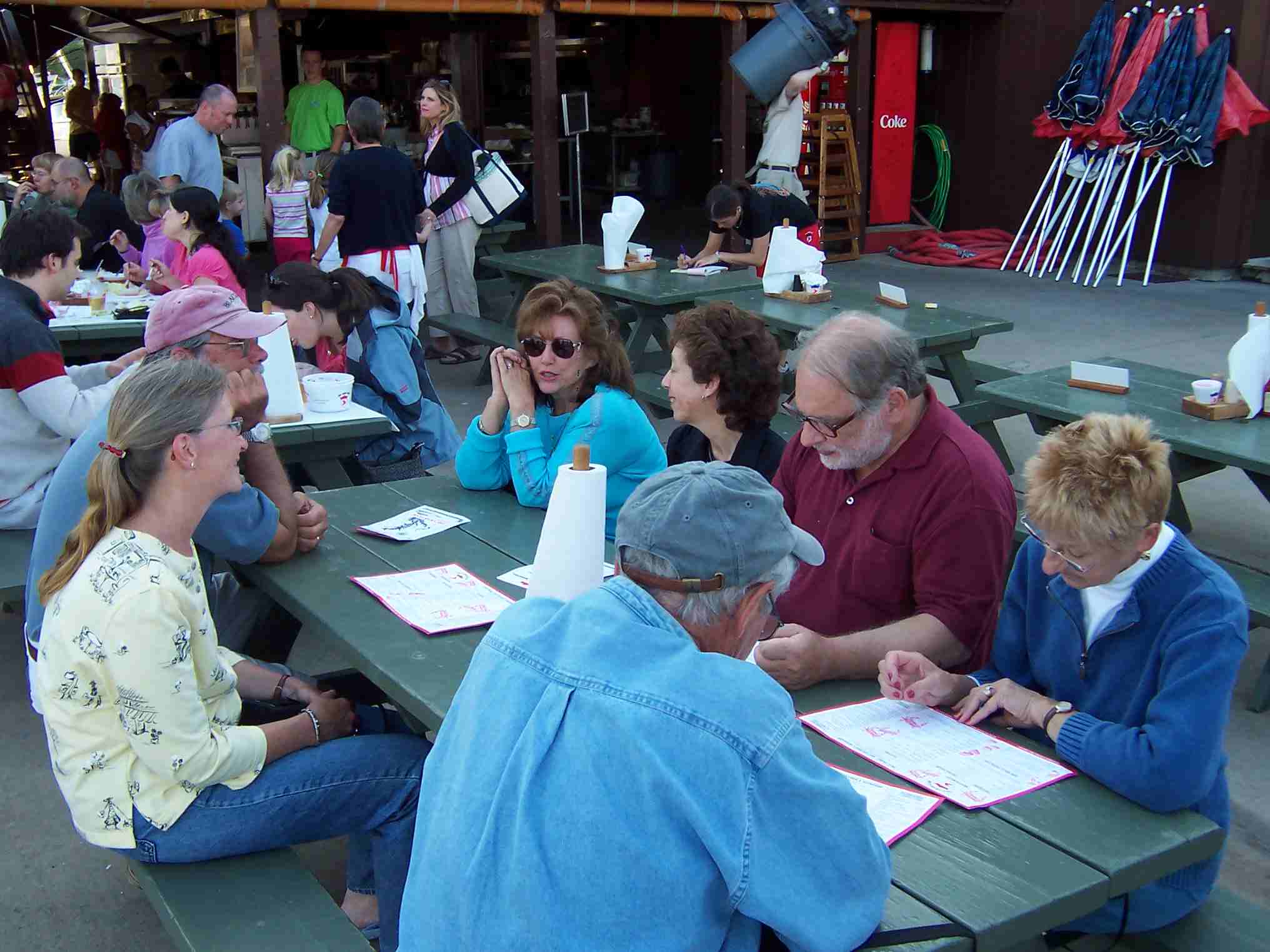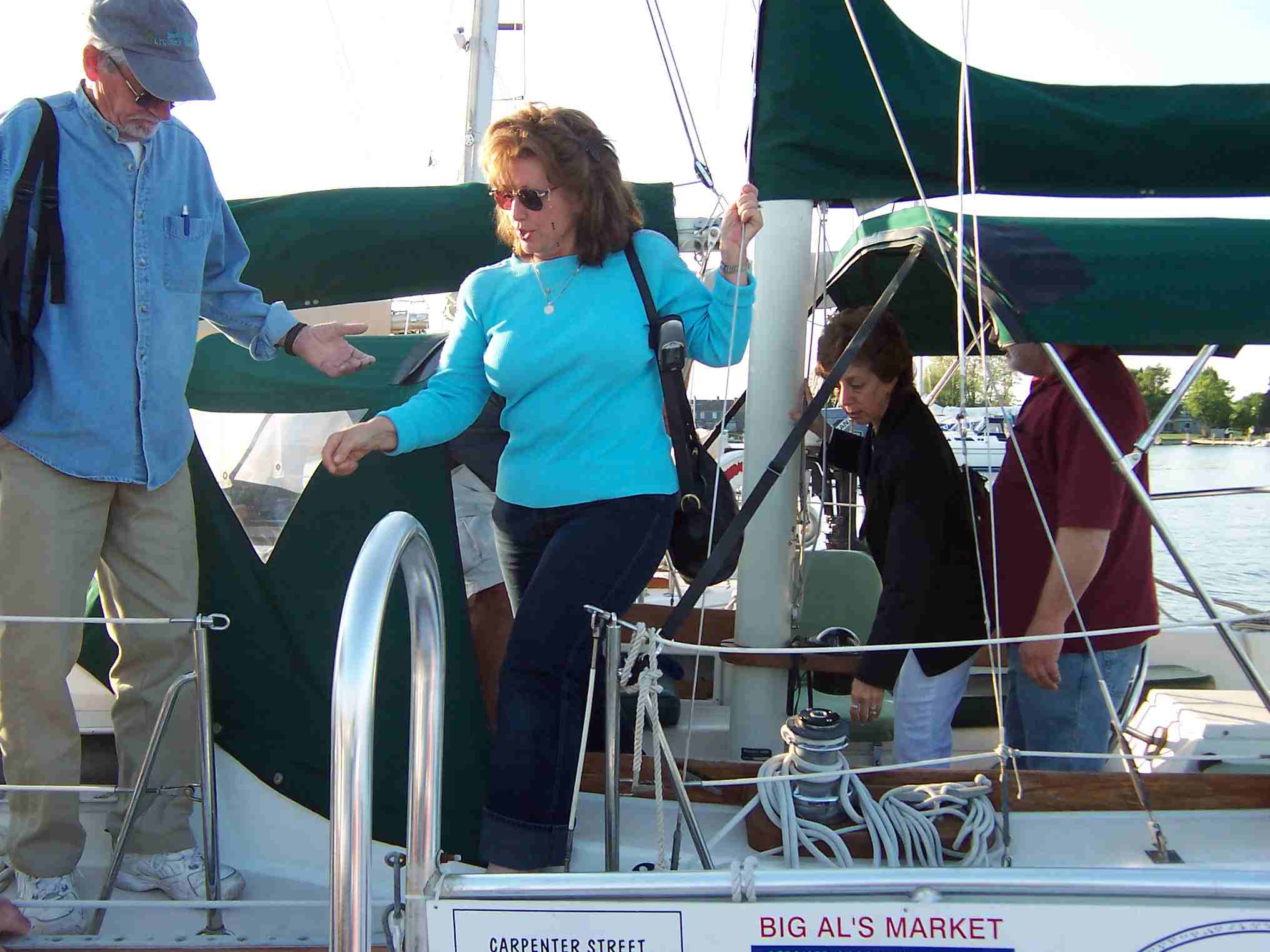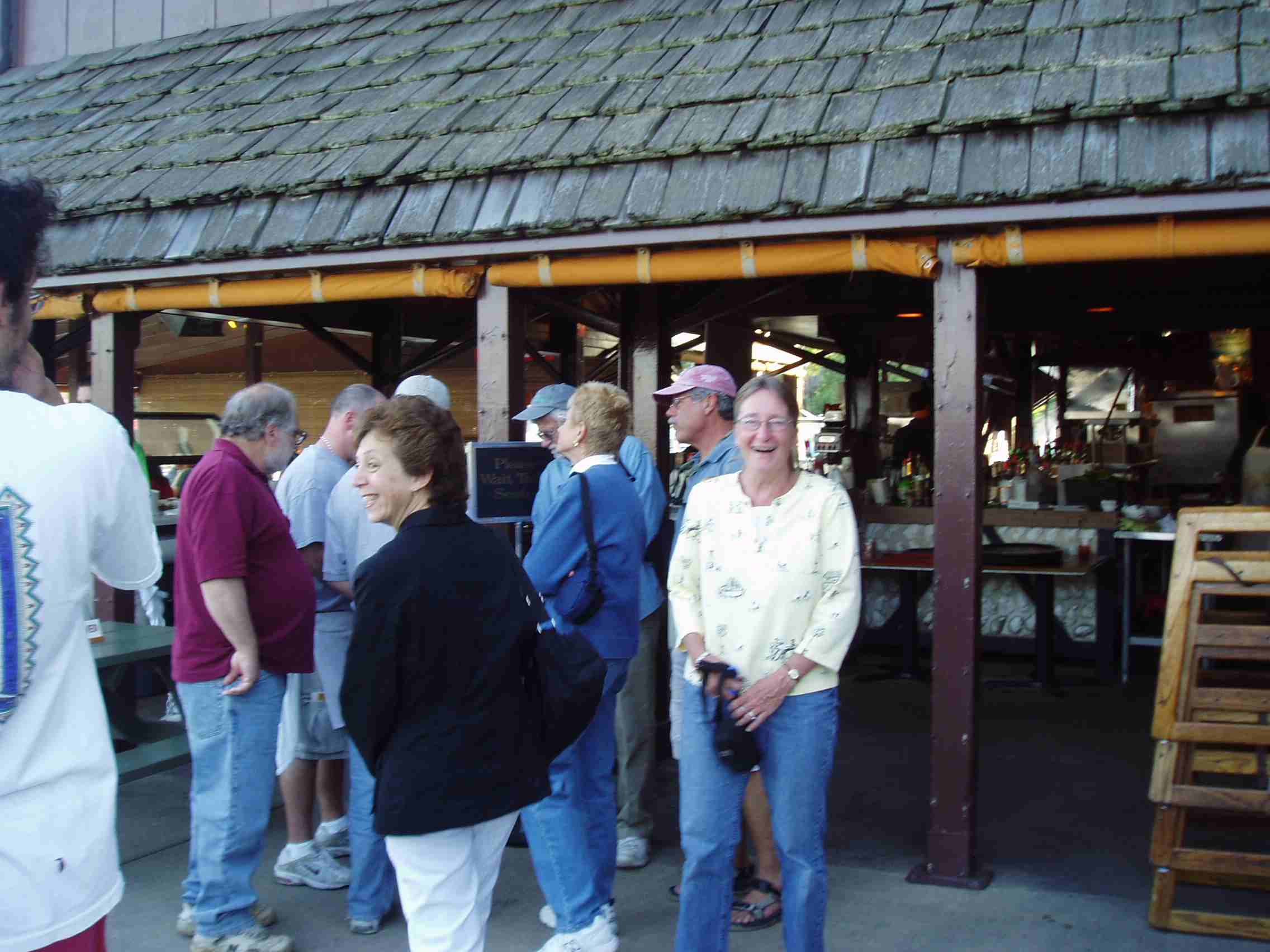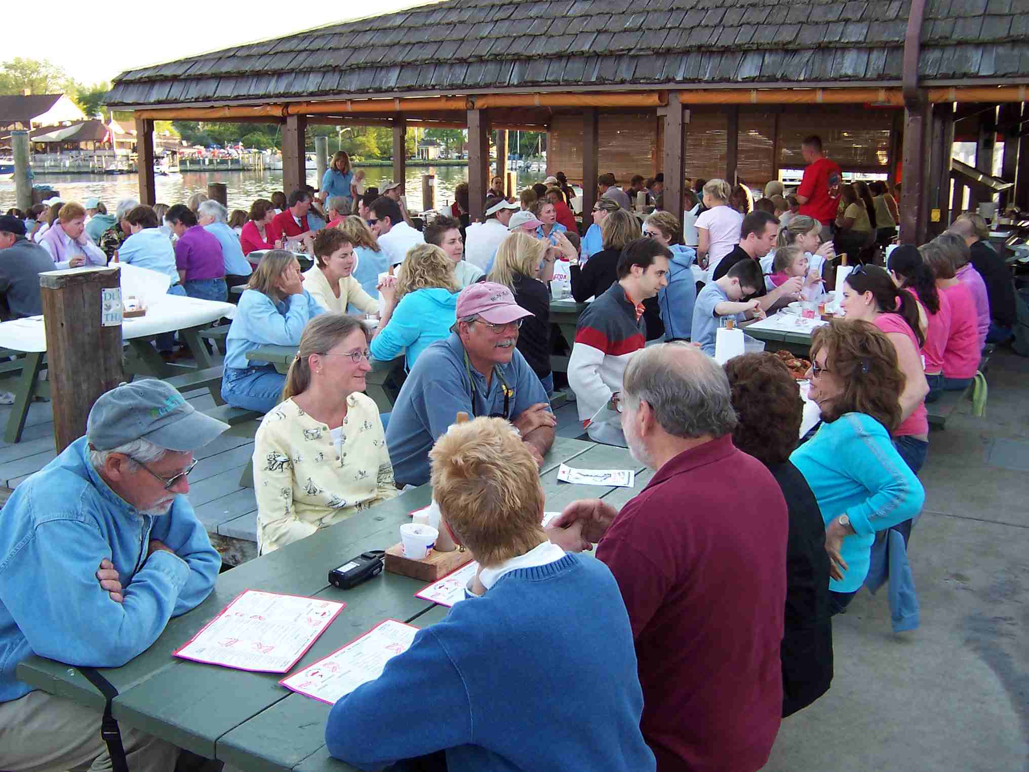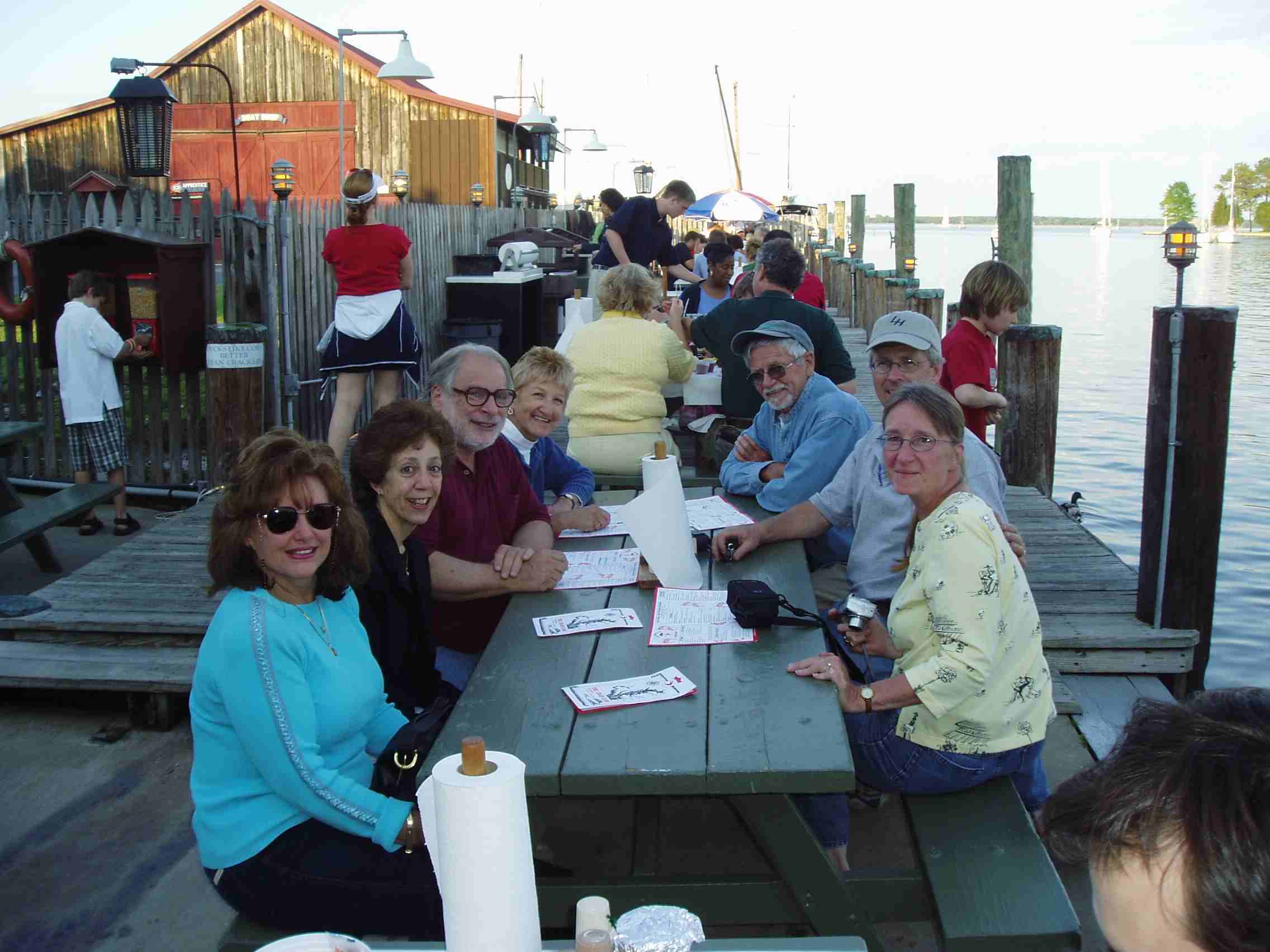 Judye and I arrived by car at St Michaels and were able to hook up with the group via cell phone and were directed to the water taxi. It was easy to spot a pair of ketches (Bill & Mary on Alibi II, Jack & Mary Beth on Voyager) rafted up. They had already been Joined by Fran and John. Chicken wings, grapes, cheese and crackers, veggies and drinks awaited the weary travelers. The conversation quickly drifted around to our boats and before we knew it, we were bearing down on dinner time. The water taxi took us to the Crab Claw. The food was excellent and bountiful. Enough so that you had to sit on the "doggie box" in order to close it.