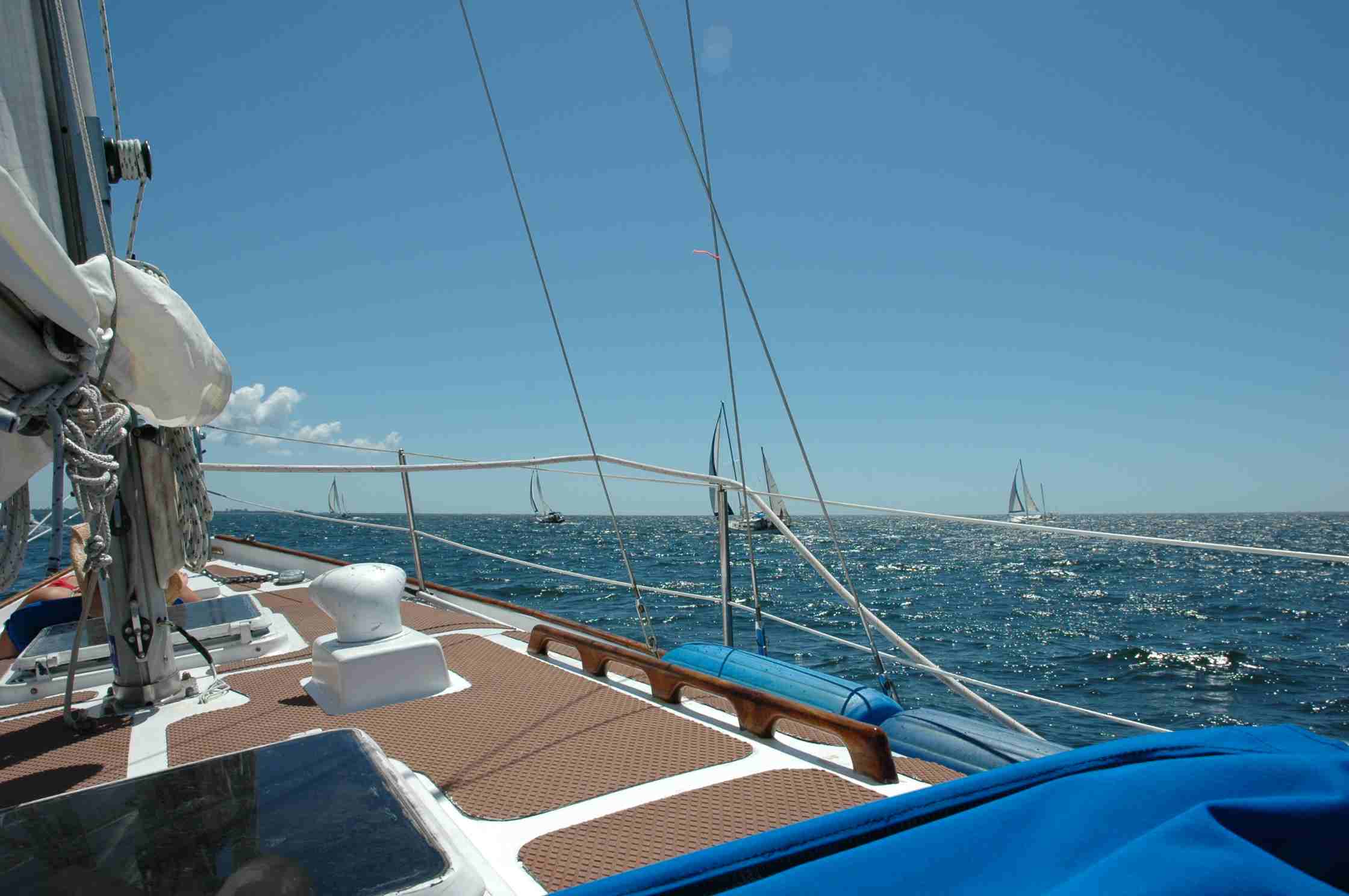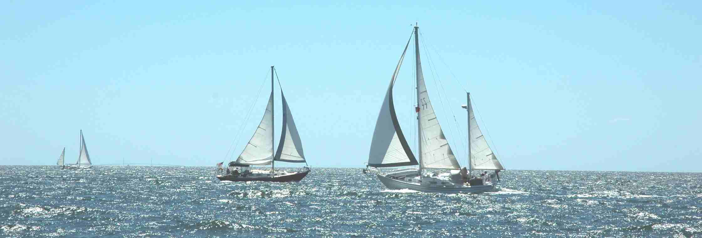 Gypsy on Starboard tack, an Allied Seabreeze 35, Ephraim W. on a port tack, another Seabreeze, Destiny, jib and jigger