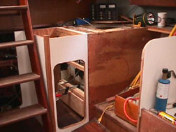 The original doors for my engine access were fairly symmetrical and did contain two small, removable drawers. In the new arrangement I have opted to do away with these and have fitted two larger/longer drawers to the new navigation locker. These face fore & aft and slide from the forward side of the nav locker and just above the settee. A third, wider unit now faces inboard from a lower aspect and replaces the original locker door below the navigation surface.