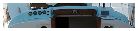 The new digital, engine instruments and the Raytheon Bi-Data now reside in a custom made, curving, fiberglass pod that is mounted across the deck house. The forward panel is cambered for additional protection as a weather coaming and more vertical attachment point for the dodger is another design element.