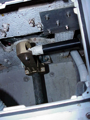 The new Edson tiller arm mounts below the upper rudder shaft bearing (as seen through my access locker in the aft cockpit bulkhead) the aluminum plate secures the thwartships mahogany support to the steering support structure giving incredible new overall support to the entire transom area.